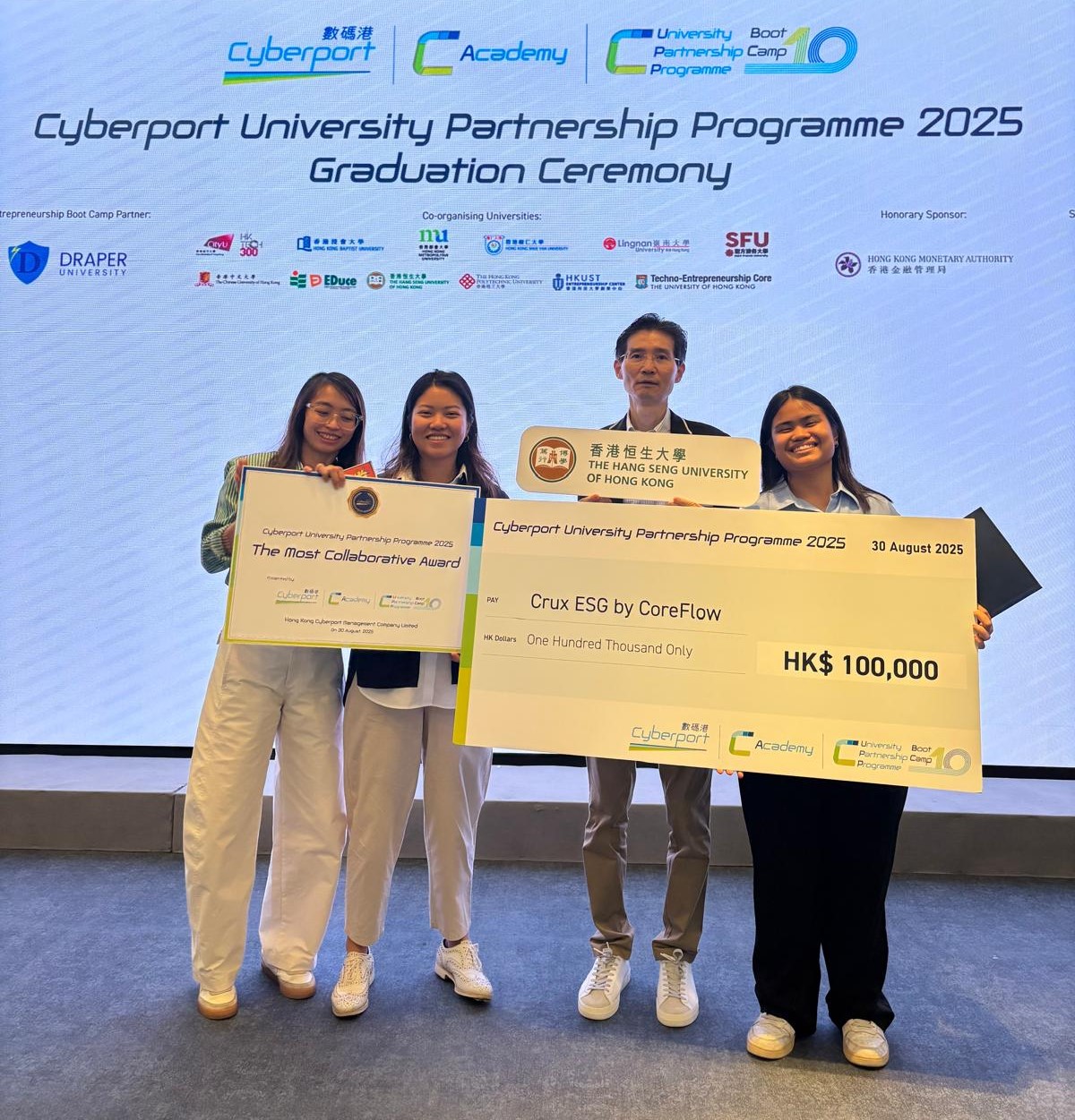 A student team comprising Reeze Anne Mendoza Ramiro (BBA (Hons) in Financial Analysis and FinTech, Year 2), representative from the FinTech team in the Department of Economics and Finance Ms Florence Li, and a student from HKU, won Championship in the Cyberport University Partnership Programme 2025, securing HK$100,000 in seed funding from the Cyberport Creative Micro Fund.